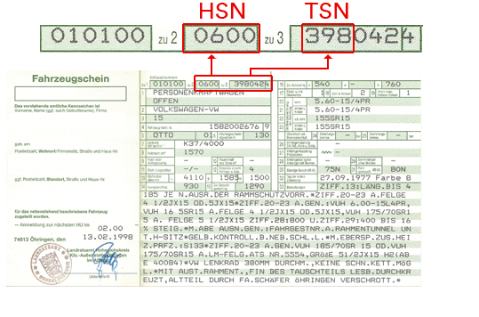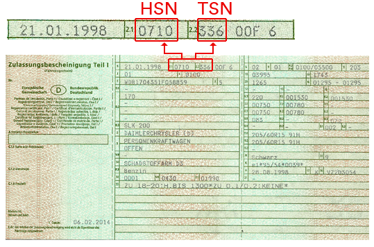 Die Schlüsselnummern aus dem Fahrzeugschein / Zulassungsbescheinigung Teil I: zu 2. (2.1) und